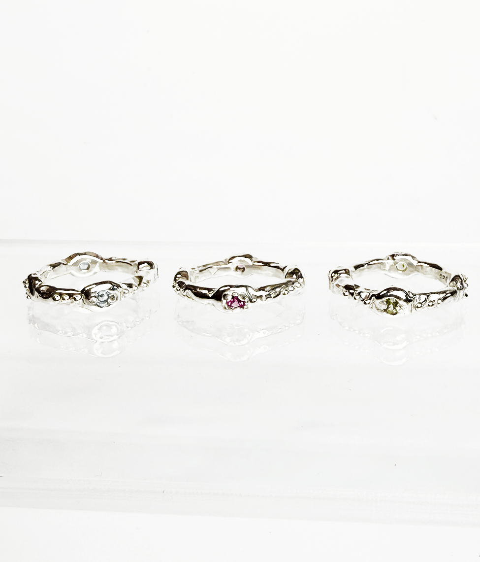Crafted from high-quality recycled sterling silver, each piece is expertly carved in wax before being cast, making it truly unique—no two are ever the same. The molten texture offers a raw elegance that pairs beautifully with the colorful sparkle of hand-set gemstones.
