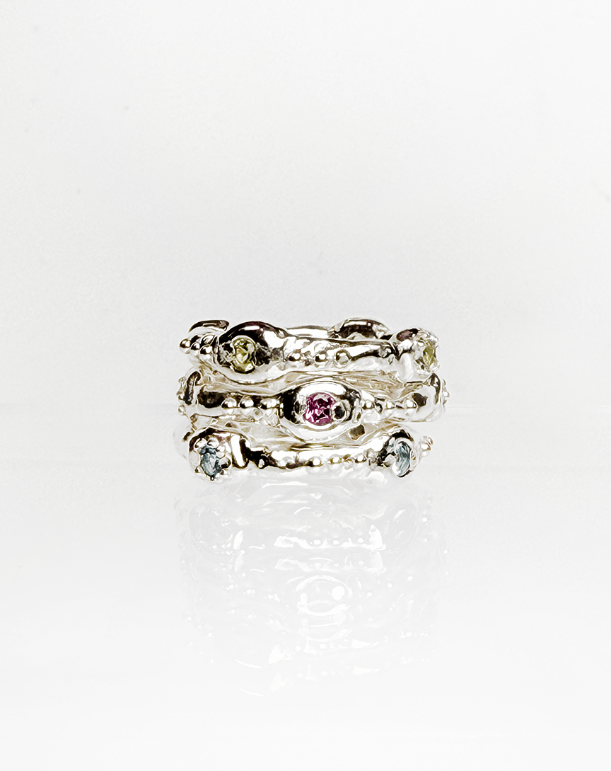 Sweet Stacking Rings This Set of 3 colorful gemstone rings—bright pink Malawi garnet, vivid peridot, and sparkling blue topaz—adorn these playful stacking rings, each handmade with a molten-inspired band that curves and swirls like soft candy. The slightly chunky, glossy metal wraps each stone with sculptural fluidity, creating a whimsical yet refined look.